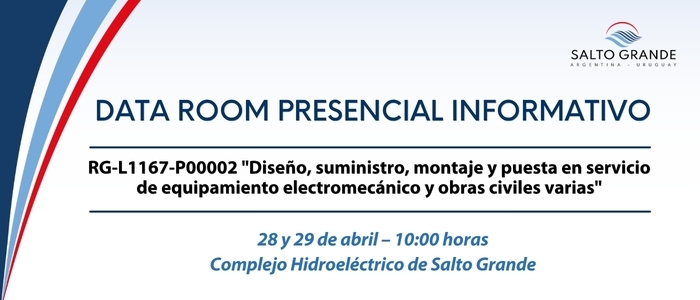 En el marco de la Etapa II-a del Programa de Renovación de Salto Grande (RSG), la Comisión Técnica Mixta de Salto Grande (CTM) invita a empresas interesadas a participar de un Data Room presencial, a efectos de presentar los aspectos generales del proyecto de referencia. El proyecto contempla un presupuesto estimado de USD 23.570.000, por lo que se recomienda la participación de empresas con experiencia en proyectos de similar escala y complejidad.